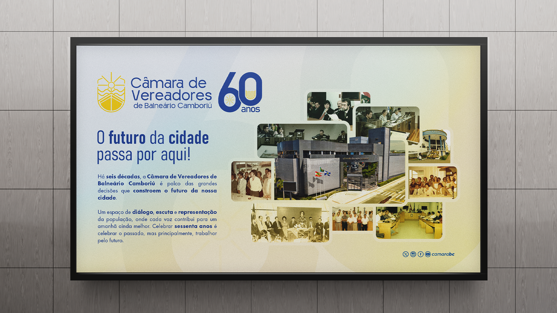 A campanha celebra os 60 anos da Câmara de Vereadores de Balneário Camboriú, valorizando sua trajetória e papel fundamental. Ela cumpre seu objetivo através da celebração da história, reconhecimento do papel da Câmara na transformação de Balneário Camboriú e ao inspirar a comunidade a construir o futuro juntos.